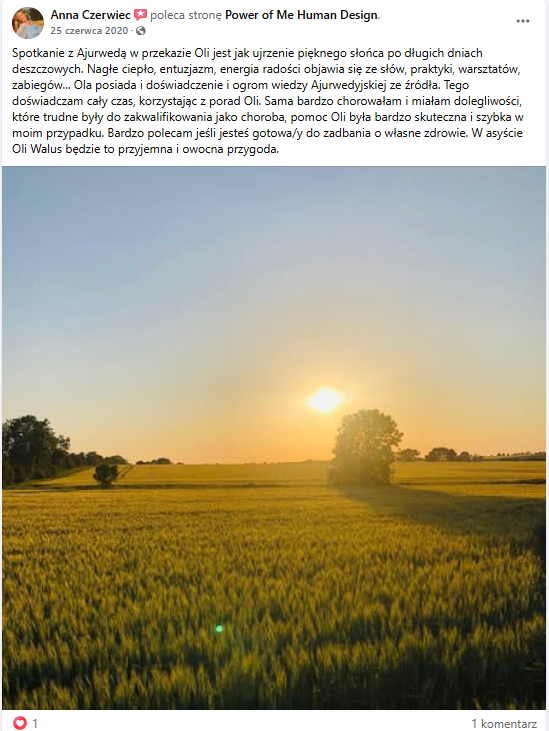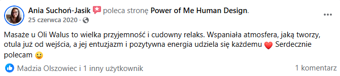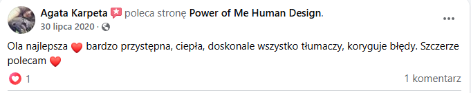 Polecam odczyt Human Design u Oli,niesamowita osoba,która wykonuje to z głębi serca.Human Design otworzył mi oczy na moją przyszłość,pokazał wiele możliwości, oraz to jak wcześniej żyłam programami ,które zostały mi wgrane.Mega polecam.