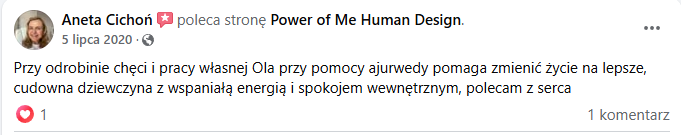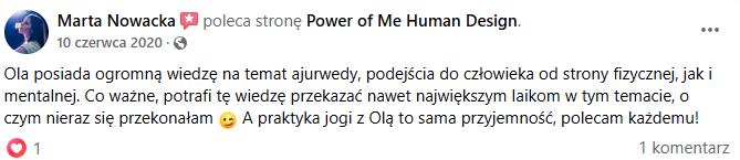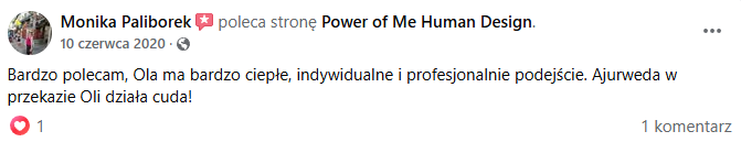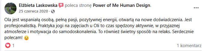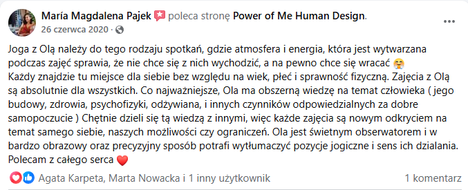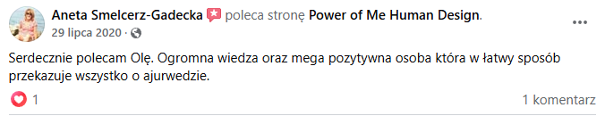 Serdecznie polecam rozpoczęcie eksperymentu z Olą oraz udział w warsztatach na żywo. Ola w niezwykły sposób przedstawia temat Human Design i przyciąga wyjątkowych ludzi. Dodatkowo emanuje bardzo pozytywną energią, posiada niesamowitą wiedzę z wielu dziedzin oraz otwarty umysł. Na odczyt do Oli zgłosiłam się częściowo z ciekawości, a częściowo z potrzeby wsparcia w wyborze kolejnych kroków życiowych. Nie spodziewałam się, że wiedza o Human Design, przekazana przez Olę, aż tak bardzo mi pomoże – i to na wszystkich potrzebnych płaszczyznach: życia osobistego, zawodowego, zdrowia fizycznego oraz psychicznego.