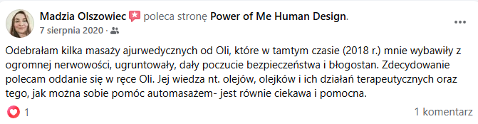 Odczyt Human Design u Oli był dla mnie prawdziwym przełomem. Dzięki niemu zrozumiałam wiele schematów, które powtarzały się w moim życiu, a których wcześniej nie potrafiłam nazwać ani wyjaśnić. To doświadczenie pomogło mi spojrzeć na siebie z zupełnie innej perspektywy – z większą akceptacją, spokojem i zrozumieniem.